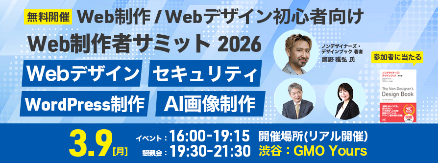 対象の方:Web制作初心者/Webデザイナー初心者/デザイン業務をしている方/生成AIでの画像制作に興味がある方/WordPress制作初心者/Webセキュリティに興味がある方