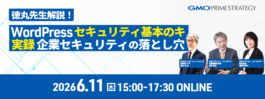 皆様のWebサイトは大丈夫でしょうか?このような状況を受け、プライム・ストラテジーでは国内ウェブセキュリティの第一人者である徳丸浩先生を招き、「ウェブセキュリティ基本のキ WordPress編」を講演いただく運びとなりました。そして、当社のウェブセキュリティ人気講師である、プライム・ストラテジー代表取締役 吉政忠志と企画開発担当執行役員の相原知栄子がWeb改ざん事例と傾向、市場動向、そして対策を解説します。